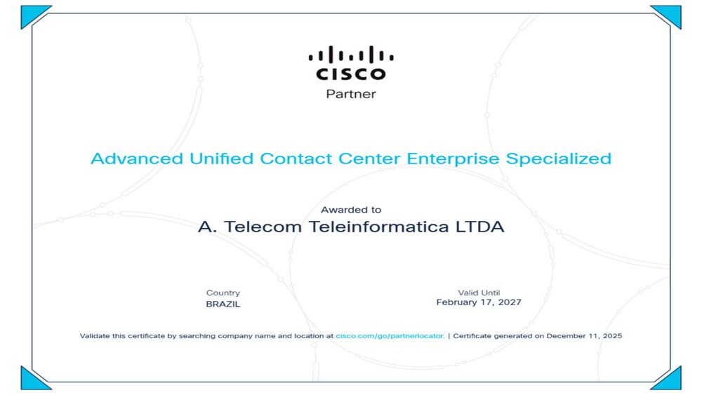 A A.Telecom conquista mais um reconhecimento em sua trajetória como integradora de soluções de TI e telecom. Agora somos Cisco Advanced Unified Contact Center Enterprise Partner, reforçando nosso compromisso em entregar excelência e inovação ao mercado nacional.